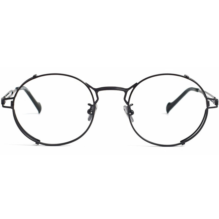 These statement round glasses combine ultra-light titanium with a bold, industrial silhouette. The full-rim front is clean and minimal, while cut-out temples add airy negative space and reduce weight. Adjustable titanium nose pads and curved acetate tips keep the fit secure and comfortable for all-day wear. Perfect for creative professionals and design lovers, this frame flatters oval, heart and square faces and pairs easily with monochrome outfits or minimalist streetwear. Available in black, gray, gold, silver and bronze, it keeps the overall look refined.