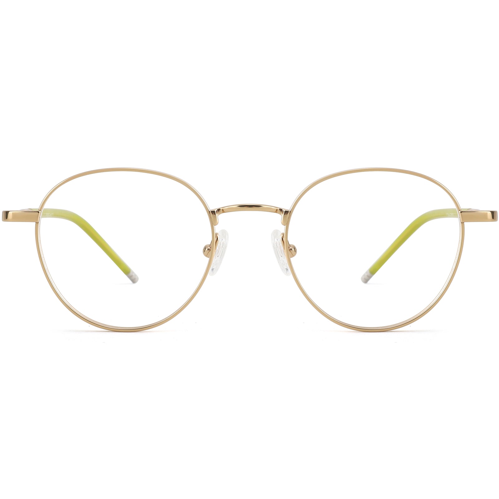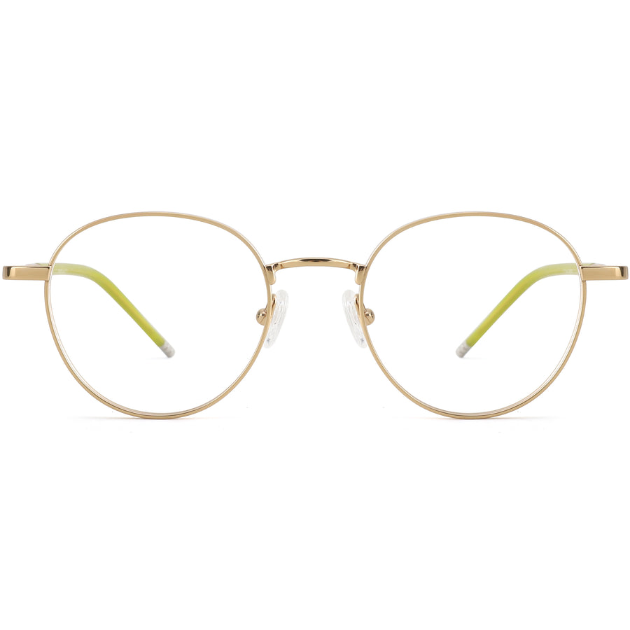 These round glasses are crafted with a blend of shiny metal and acetate colorful acetate tips, offering an understated yet refined appearance. The thin titanium frame is lightweight, ensuring all-day comfort, while the adjustable nose pads allow for a tailored fit. The subtle transition from metallic gold to translucent gray at the temples gives a touch of modern elegance, making these frames perfect for those who appreciate classic styles with a contemporary twist.