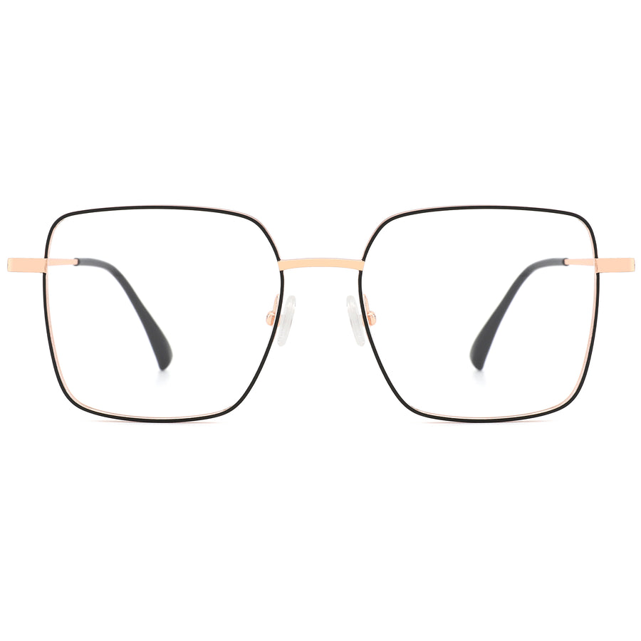 These oversized square glasses frames, crafted from lightweight titanium, showcase a unique hexagonal shape that brings a modern twist to the classic round design. The subtle contrasting colors along the rim enhance the sophisticated aesthetic, adding a refined edge to the overall look. Adjustable nose pads offer long-lasting comfort, while flexible temple arms ensure a secure and personalized fit. Available in gray, silver, gold, and rose gold with black accents, these frames seamlessly blend sleek minimalism with a stylish statement, perfect for those seeking a subtle yet impactful look.