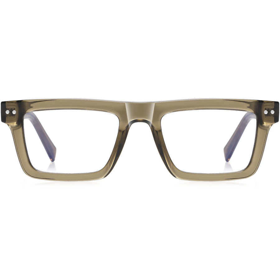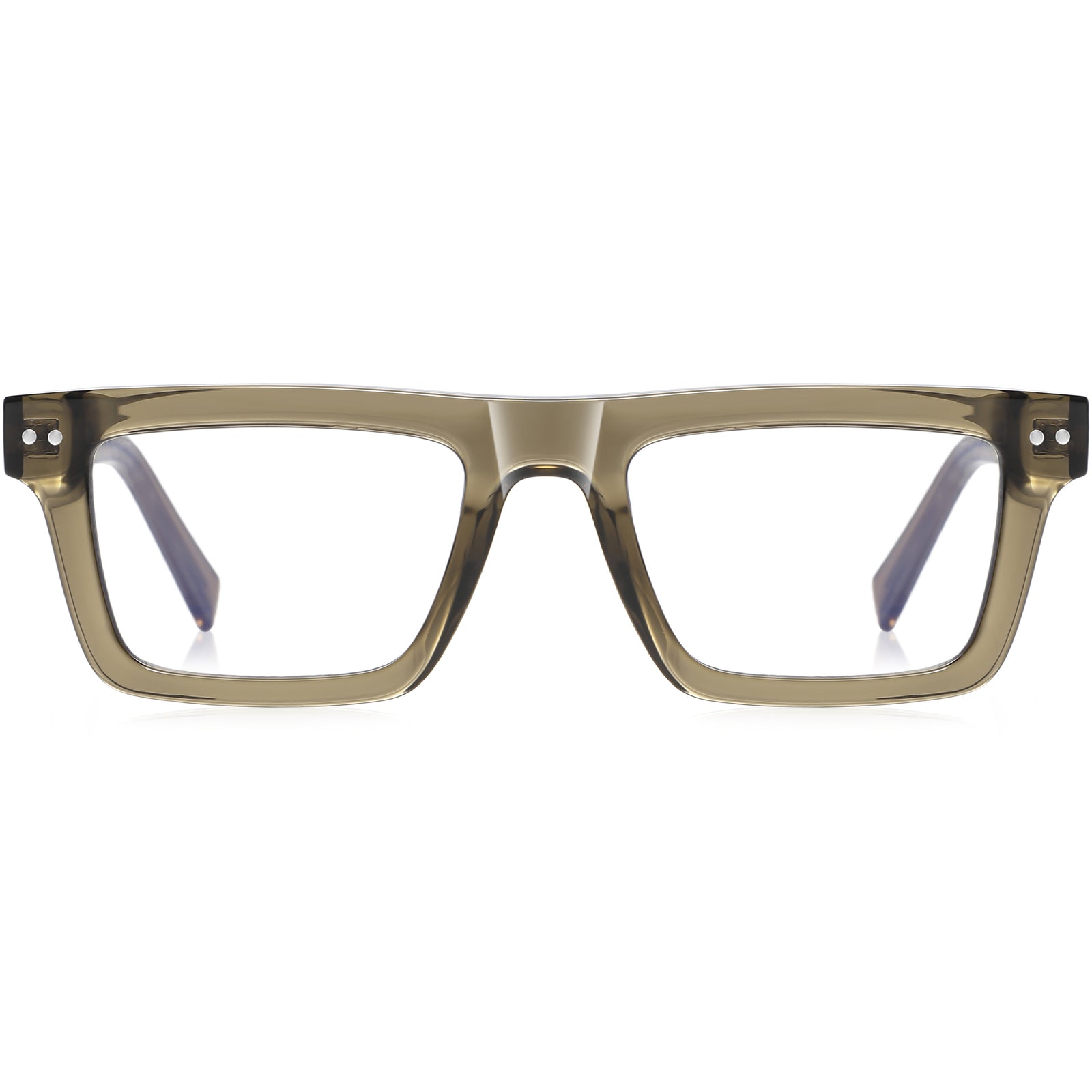These flat-top rectangle glasses feature a black upper rim and a translucent/tortoiseshell lower rim. Made from lightweight, glossy, sturdy TR90 with metal corner details, they are durable and stylish. Perfect for both regular glasses and sunglasses, offering a comfortable wear.