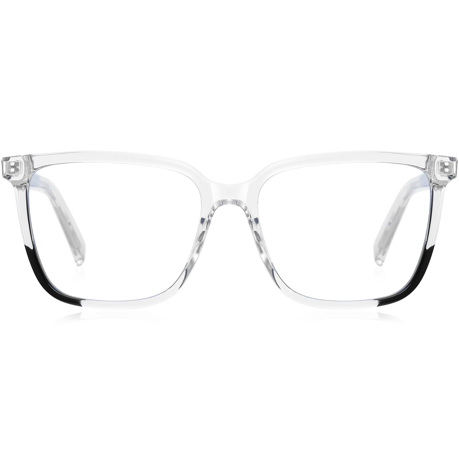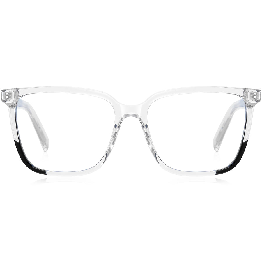 Discover simplicity with these square glasses, crafted from the highest quality TR90 with a glossy finish. Durable and lightweight, they feature spring hinges for added comfort. A different color rim on the lower right corner adds a unique touch, complemented by a subtle pattern on the temple arms. Perfect for a focused, stylish look.