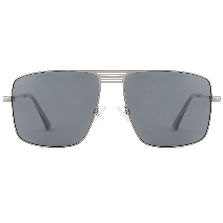 These modern sunglasses present a bold, modern take on the aviator style with a distinctive square lens shape. Crafted from high-quality metal, the frame showcases a sleek glossy finish that exudes sophistication. The cut-out bridge detail is a unique feature, consisting of a series of horizontal slits that add a touch of edgy minimalism while also providing a lighter look. The polarized lenses offer 100% UV protection, reducing glare and ensuring your eyes remain comfortable in bright conditions. The design includes adjustable silicone nose pads for a custom fit while the spring hinges allows the sunglasses to rest comfortably on a variety of face shapes.