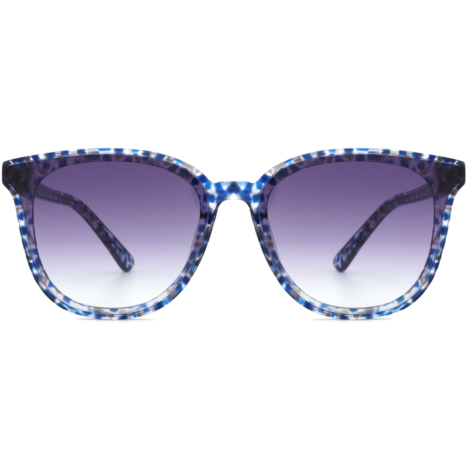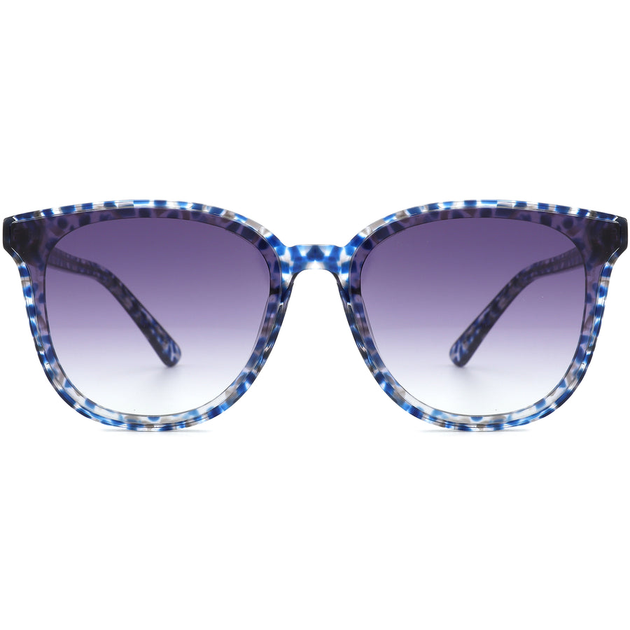 These square sunglasses feature a glossy blue acetate frame adorned with striking mosaic patterns, offering a luxurious and stylish finish that elevates any look. The gradient polarized lenses provide excellent coverage while offering 100% UV protection, shielding your eyes from harmful UVA and UVB rays. Designed for a secure and comfortable fit behind the ears, these sunglasses are both fashion-forward and timeless, making them ideal for those with oval and heart-shaped faces. Perfect for adding a touch of sophistication to any outfit.