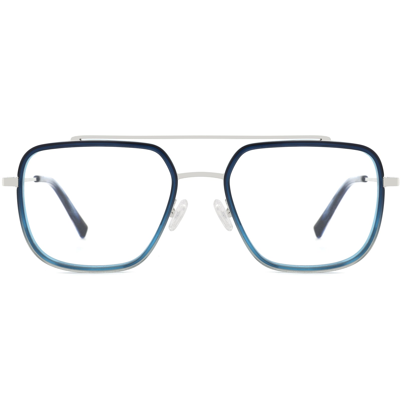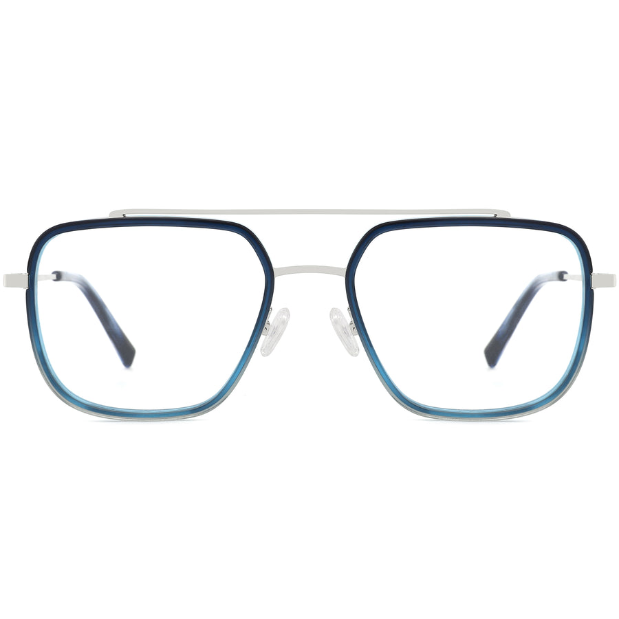 These modern aviator glasses feature a distinctive geometric lens shape and a stylish mix of acetate front rims with sleek metal temple arms. The flat top adds a contemporary edge, while spring hinges and adjustable nose pads provide a secure, comfortable fit for all-day wear. Lightweight and durable, these frames are available in gradient blue and green, making them a chic and practical choice for those seeking a bold, modern look.