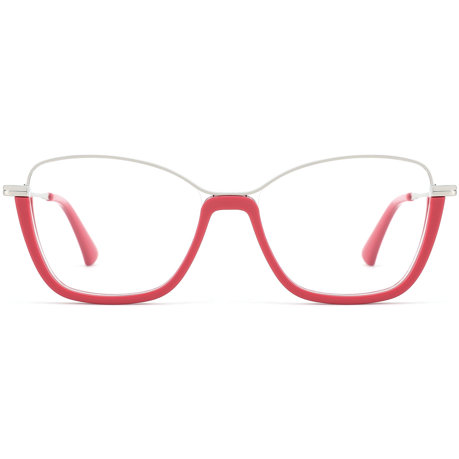 These unique geometric glasses showcase a bold "reverse full-rim" design, featuring an acetate lower rim contrasted with slim metal upper rims for a striking, modern look. Lightweight and comfortable, they are crafted for all-day wear with flexible spring hinges that ensure a custom, secure fit. Available in tortoiseshell, black, and red, these frames add personality and flair, making them perfect for round face shapes seeking a distinct style statement.