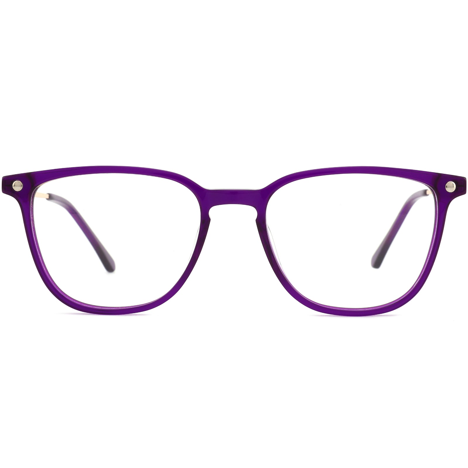 These classic purple square eyeglasses for women feature a minimalist design that combines style with functionality. The durable acetate front frame is enhanced by iconic metal corner details, adding a touch of elegance. Delicately engraved metal temple arms provide a refined finish, blending seamlessly with the frame. Lightweight and comfortable, they are crafted for all-day wear with flexible spring hinges that ensure a custom, secure fit. These frames are a chic and timeless choice, bringing sophistication and comfort together in a versatile accessory.
