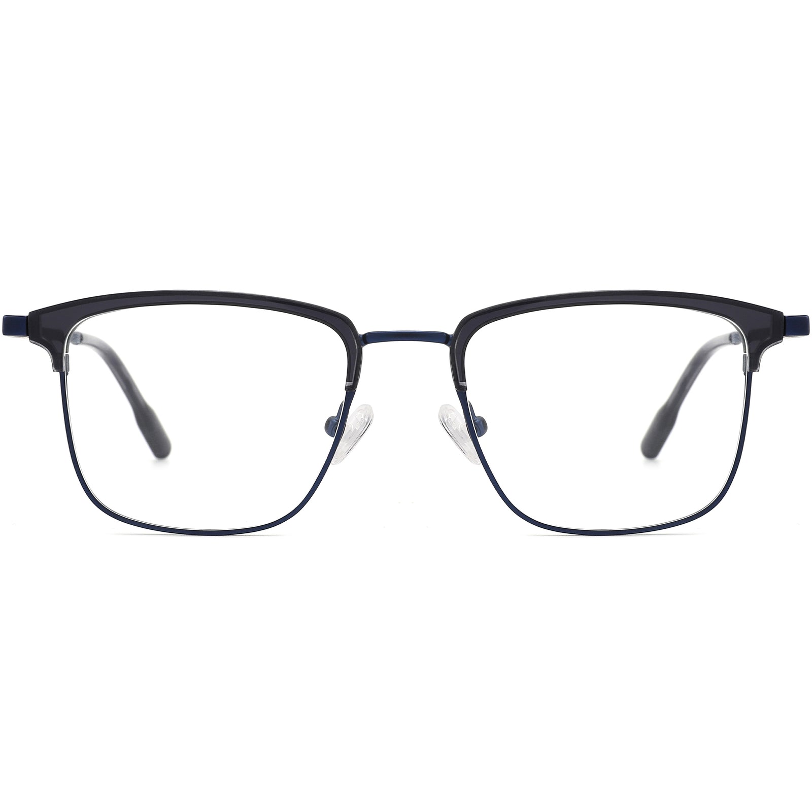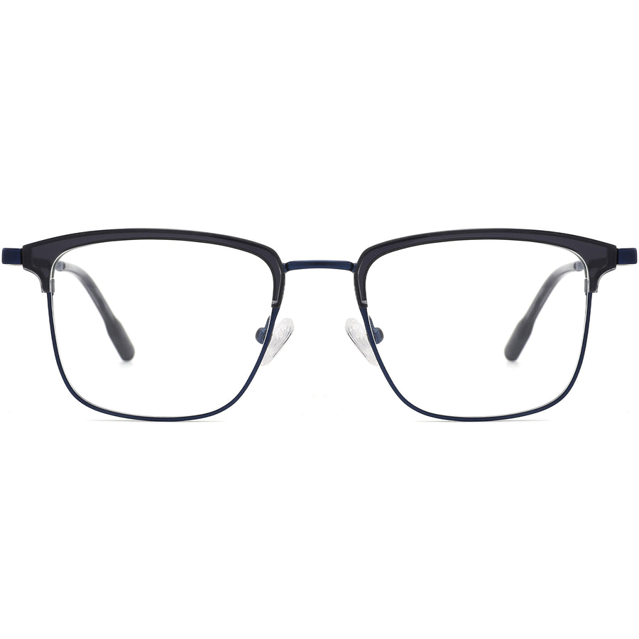 These sophisticated square eyeglasses feature a stylish blend of acetate temple tips and sleek metal temples, with acetate detailing along the front for a modern touch. Adjustable nose pads ensure a customized and comfortable fit, while slender metal temple arms and spring hinges provide a lightweight feel, ideal for all-day wear. Available in blue and silver, these frames are perfect for oval and heart face shapes, combining elegance with contemporary flair.