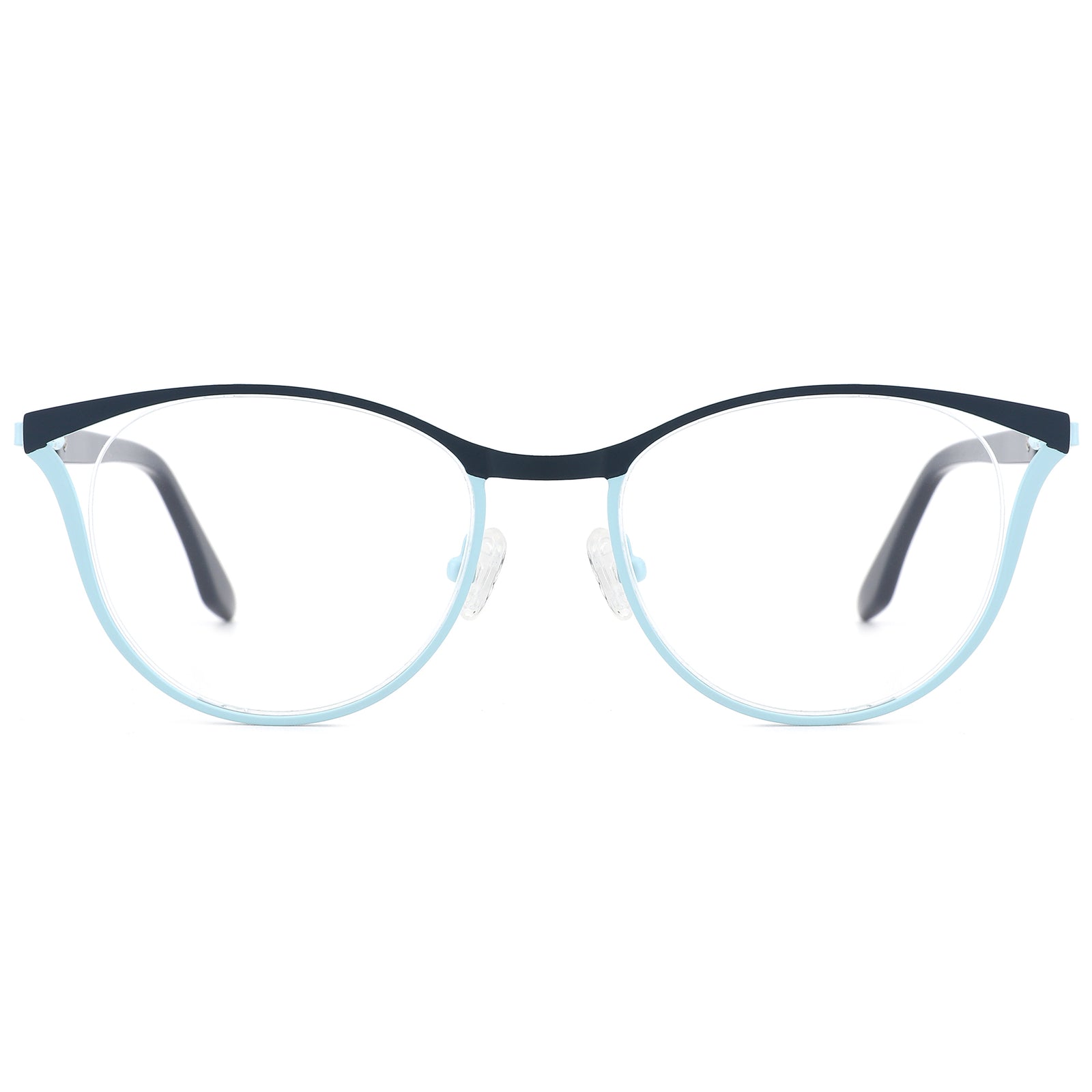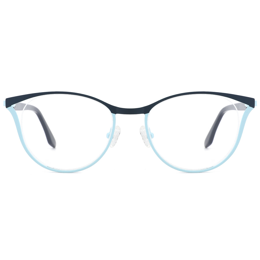 Our trendy cat-eye frames are expertly crafted from ultra-light metal, featuring a refined two-tone design at the front rim that adds a touch of sophistication. With a floating lens design, adjustable nose pads, and spring hinges, these frames ensure all-day comfort and extended wear, making them the perfect accessory for any stylish ensemble.