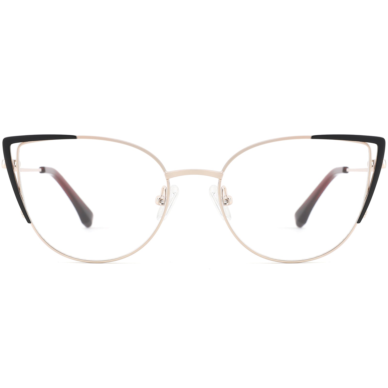 Our full-rim cat-eye frames for women are meticulously crafted from premium lightweight metal, offering a stylish blend of elegance and trendiness. Featuring a unique cut-out design and bold color accents at the corners, these frames ensure balanced comfort with adjustable nose pads and spring hinges. A perfect choice for sunglasses when paired with tinted lenses, these frames are as functional as they are fashionable.