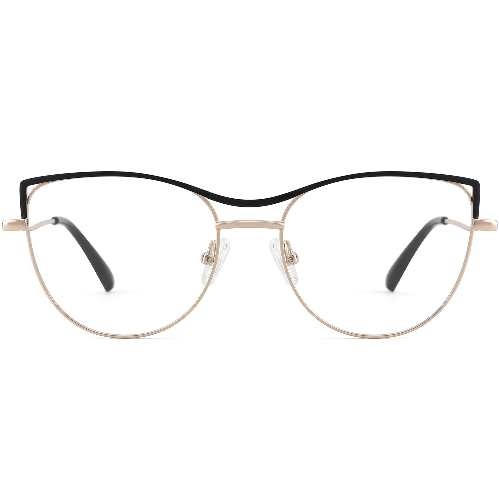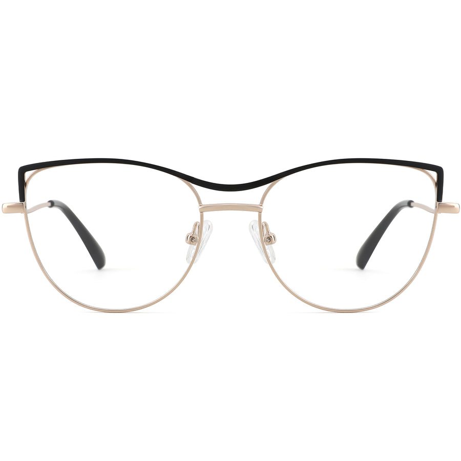 Designed for women, these full-rim cat-eye frames are crafted from premium lightweight metal and boast a trendy cut-out design with bold color accents at the corners. Adjustable nose pads and spring hinges provide a reliable fit and enhanced comfort. Add tinted lenses, and these frames transform into a chic pair of sunglasses, ideal for both style and practicality.