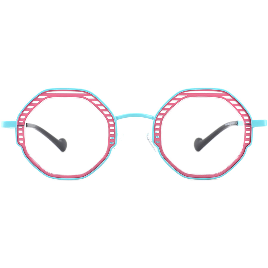 Our full-rim geometric frames, designed for both men and women, showcase a refined cut-out design at the upper front rim and come in versatile colors. Crafted from lightweight and durable metal, they ensure long-lasting comfort. The adjustable nose pads provide a secure fit, making these frames a stylish and practical option for sunglasses, perfect for any occasion.