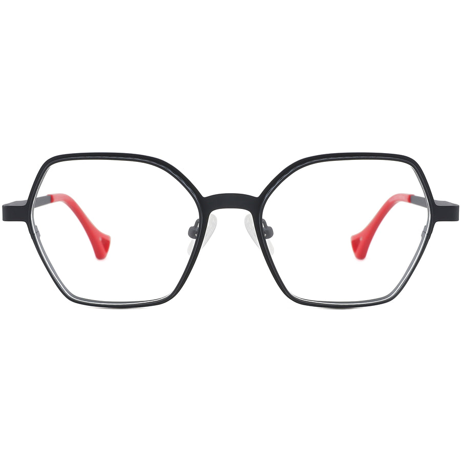 These modern geometric frames feature a distinctive lens shape, crafted from lightweight yet sturdy metal. The cut-out details on the upper front rim and colorful temple tips add a unique touch. With adjustable nose pads for optimal comfort, these unisex frames combine style and function, perfectly suited for round face shapes.