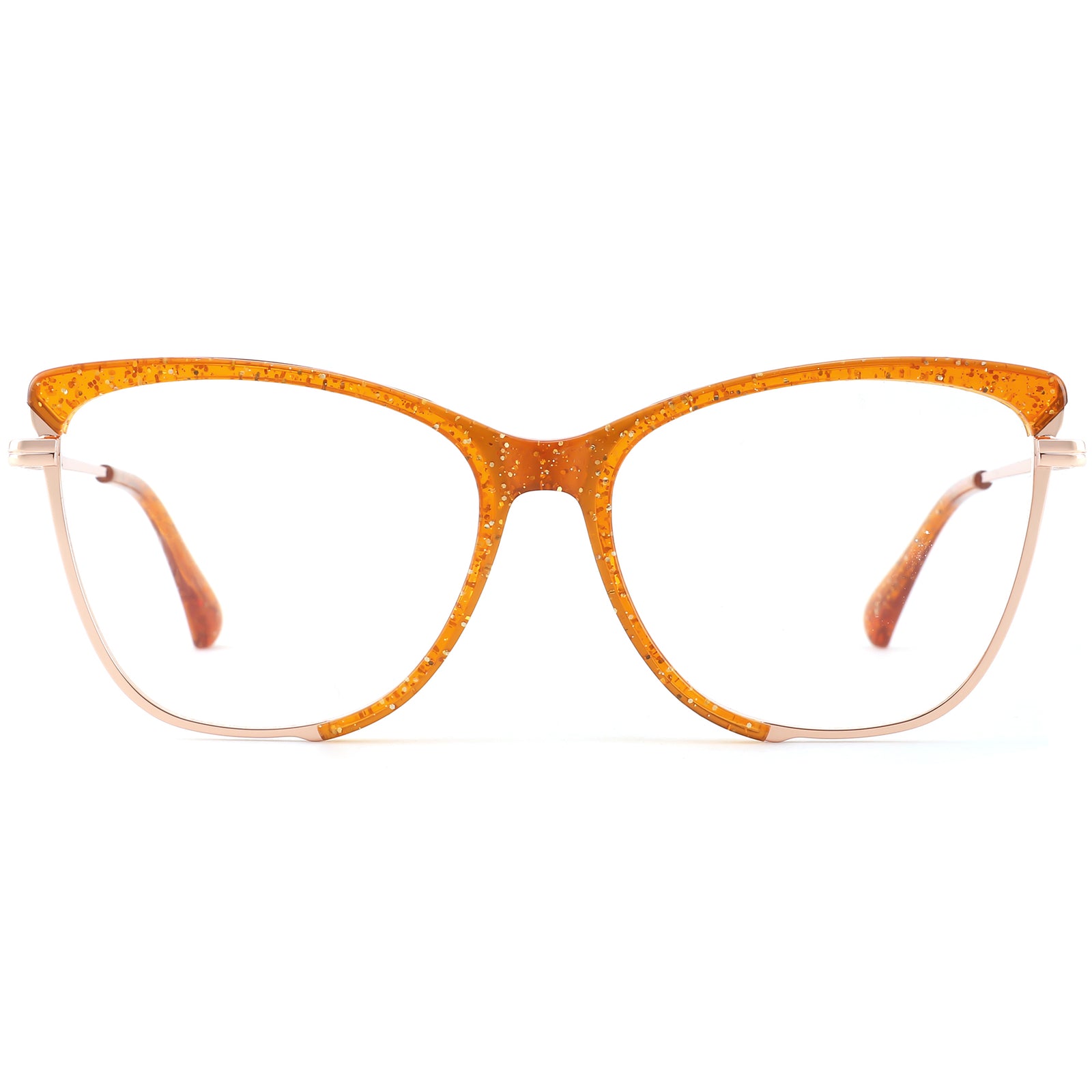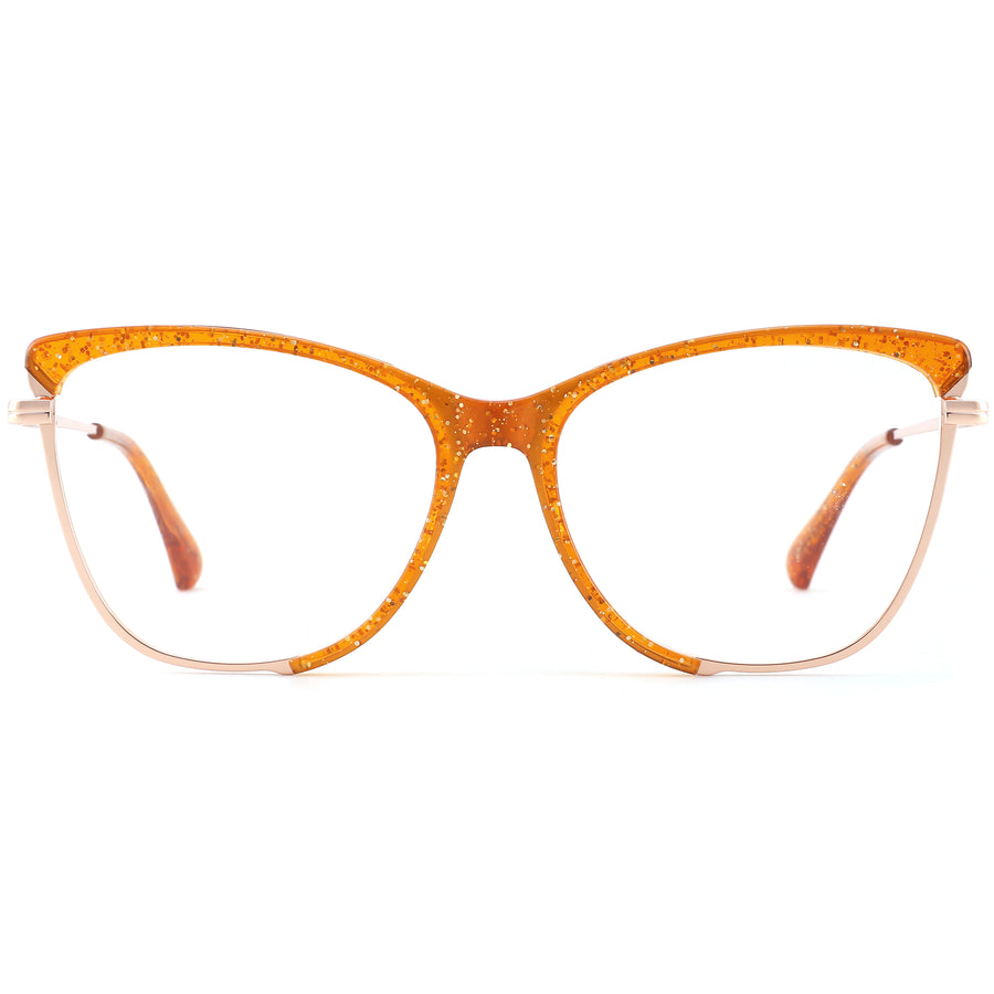 These geometric glasses feature a sleek metal frame paired with a bold acetate brow bar extending to the lower rims, bringing both color and sophistication to the cat-eye lens design. Spring hinges provide a secure, comfortable fit, while acetate-wrapped temple tips add extra comfort for all-day wear. This elegant combination of materials creates a refined, layered aesthetic, perfectly suited for oval and square face shapes. Ideal for those seeking a blend of style and professionalism, these frames offer a distinctive, modern look.